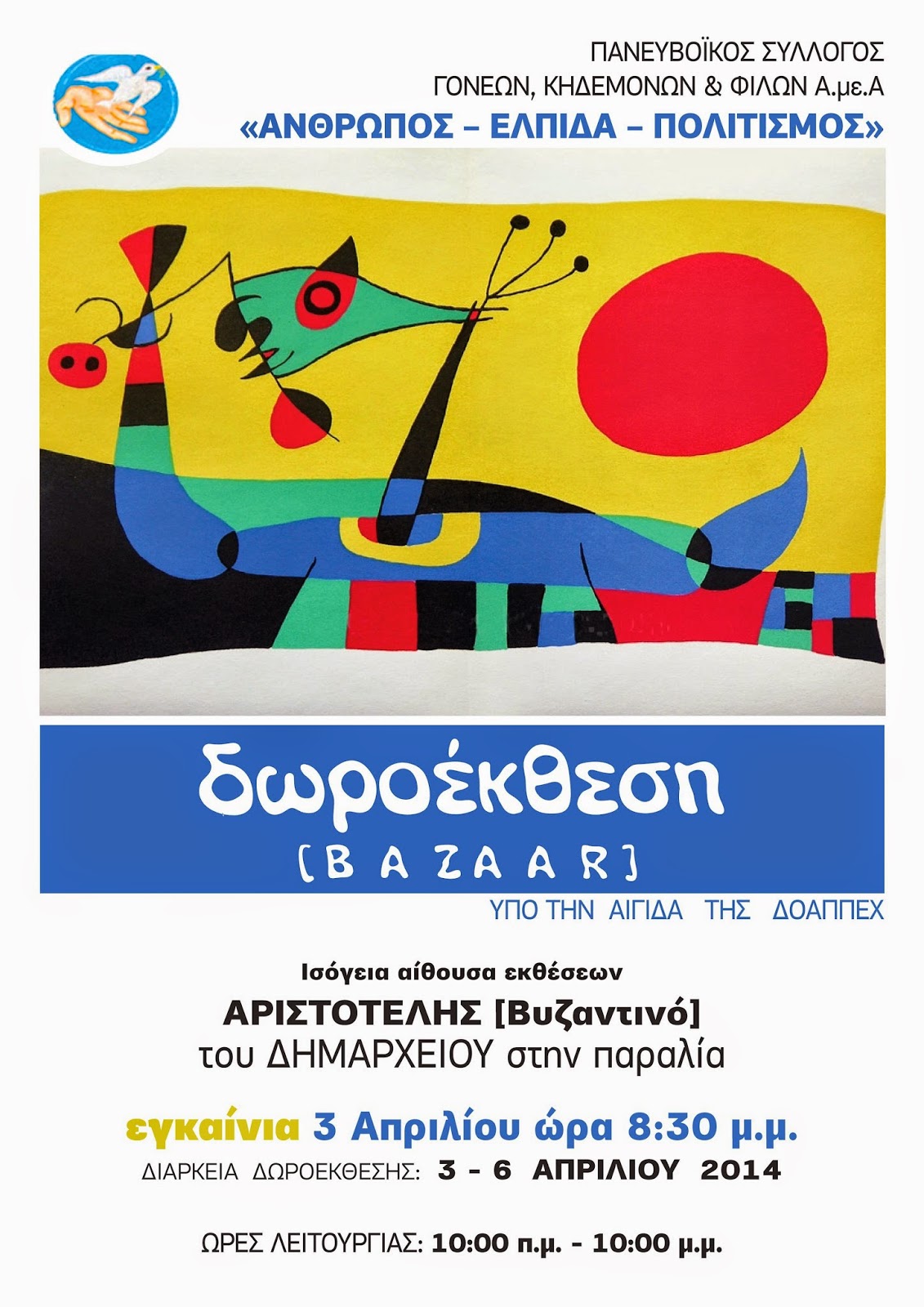 Σήμερα ξεκινά η έκθεση εργασιών Α.με.Α του Συλλόγου (ζωγραφική , κατασκευές κλπ.) & Δωροέκθεση (Bazaar) στην ισόγεια αίθουσα εκθέσεων ΑΡΙΣΤΟΤΕΛΗΣ (Βυζαντινό) του Δημαρχείου στην παραλία. Τα εγκαινια σήμερα στις 8:30 μ.μ.